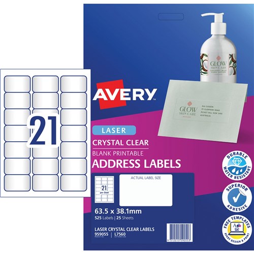 Premium glossy clear material is 100 percent transparent. Virtually disappear when applied to white and coloured surfaces. Jam-Free reliability for trouble free printing, saving time and minimising wastage. Ideal for envelopes, letters and product labelling. Made in Australia. Size: 63.5x38.1mm 525 labels, 25 sheets. 21 labels per sheet (21UP).