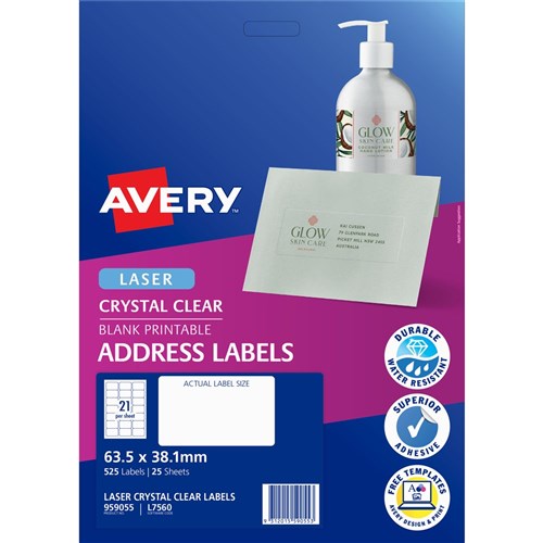 • Avery Crystal Clear Laser Address Labels White L7560 63.5x38.1mm 21UP 525 Labels