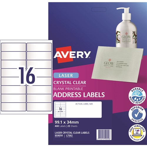 • Avery Crystal Clear Laser Address Labels White L7562 99.1x34mm 16UP 400 Labels