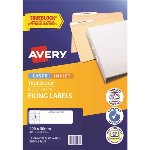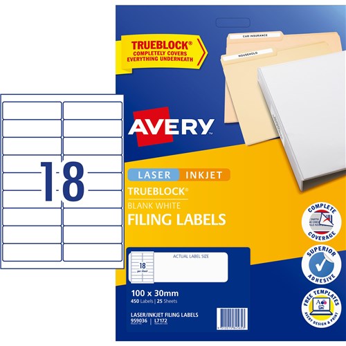 • Avery Filing Laser & Inkjet Labels White L7172 100x30mm 18UP 450 Labels 25 Sheets