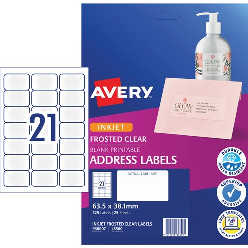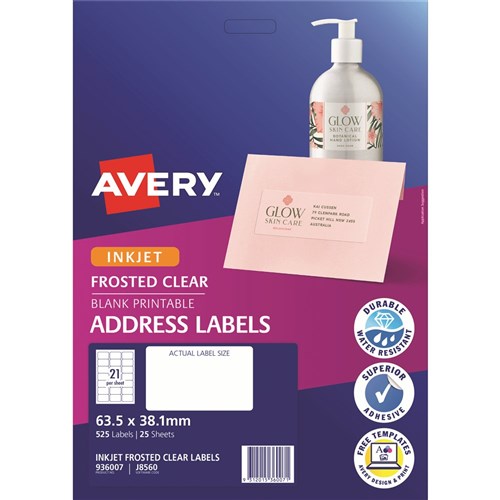 • Avery Frosted Clear Inkjet Address Labels J8560 63.5x38.1mm 21UP 525 Labels
