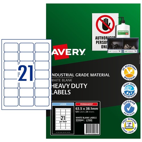 Heavy duty, waterproof, UV, oil and tear resistant unaffected by temperatures between -20°C to 80°C. Ideal for labelling equipment and organising property. Engineered to take on tough applications where a standard label is not fit for purpose. Customise your labels with Avery Design and Print, available at averyproducts.com.au/print. Made in Australia. Size: 63.5x38.1mm 525 labels, 25 sheets. 21 labels per sheet (21UP).