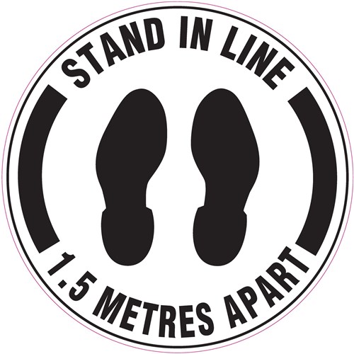 Wording: Stand In Line 1.5 Metres Apart (with footprint picto). Self-adhesive walk-on floor sign designed to bond to many different surfaces. Clear textured overlaminate protects warning message. Suitable for heavy traffic areas or wall mounting applications where graffiti or heavy wash downs are a problem. Easy to remove, just peel off the marker and wipe down the surface area. Suitable for internal use. Size: 440mm diameter.