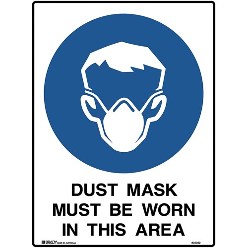 Wording: Dust Mask Must Be Worn In This Area. Material: Metal. Mandatory signs specify an instruction that must be carried out. Complies with AS 1319. Available in various materials and sizes. Size: 450W x 600mmH.