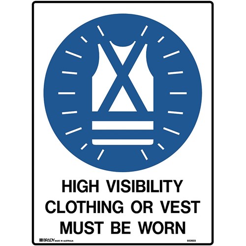 Wording: High Visibility Clothing Or Vest Must Be Worn. Material: Metal. Mandatory signs specify an instruction that must be carried out. Complies with AS 1319. Available in various materials and sizes. Size: 450W x 600mmH.