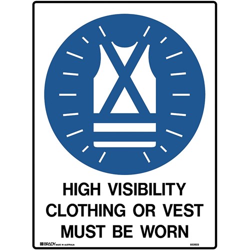 Wording: High Visibility Clothing Or Vest Must Be Worn. Material: Polypropylene. Mandatory signs specify an instruction that must be carried out. Complies with AS 1319. Available in various materials and sizes. Size: 450W x 600mmH.