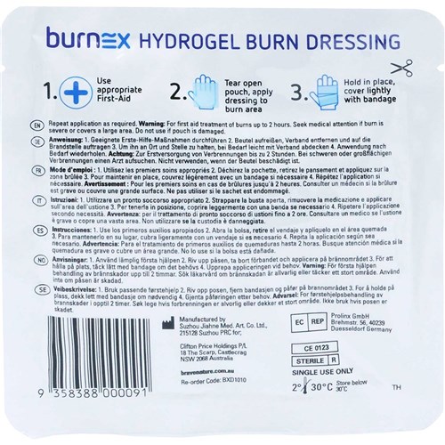 Burnex burn hydrogel is first aid burn treatment and can be used for minor burns, scalds and sunburn. Cools, soothes and helps relieve pain. Water soluble transparent hydrogel that does not disguise the extent of the burn, and can be readily rinsed off should further treatment be necessary. Helps prevent contamination. Off white/translucent gel impregnated into a white foam. Health Warning: Always read the label and follow the directions for use. Warning: For first aid treatment of burns up to 2 hours. Seek medical attention if burn is severe or covers a large area. Do not use if pouch is damaged. For severe burns seek medical attention. Store below 30 degrees Celsius.