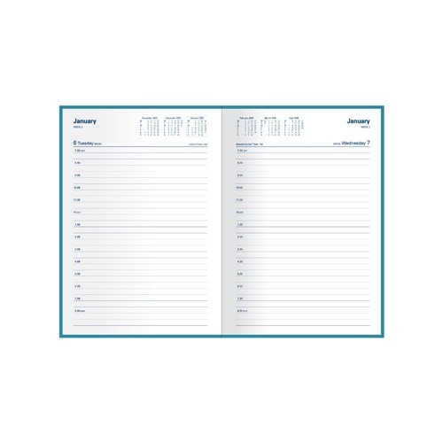 Bound in durable PVC with soft flexible cover. Printed on white paper, week numbers, Julian days, Australian and New Zealand holidays. Lay flat opening day to a page layout. Appointment times from 7am - 8pm hourly. 3 year calendars. Current and forward year planners. Financial summary. International dialling and time zones. Calendar notes. Addresses. Staff leave planner. Size: 210 x 148mm. FSC Certified.