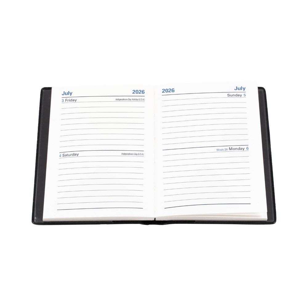 Bound in durable, welded PVC. Printed on white paper. 3 year calendars. Forward year planners. Calendar notes. Financial summary. Australian and New Zealand holidays. Size: 105 x 74mm. FSC Certified.