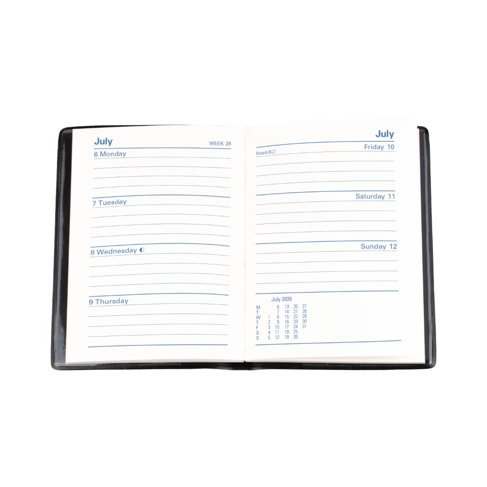 Bound in durable, welded PVC, the Belmont is available in black, burgundy and navy. Printed on white paper. 3 year calendars. Forward year planners. Calendar notes. Financial summary. Australian and New Zealand holidays. Size: 105 x 74mm. FSC Certified.