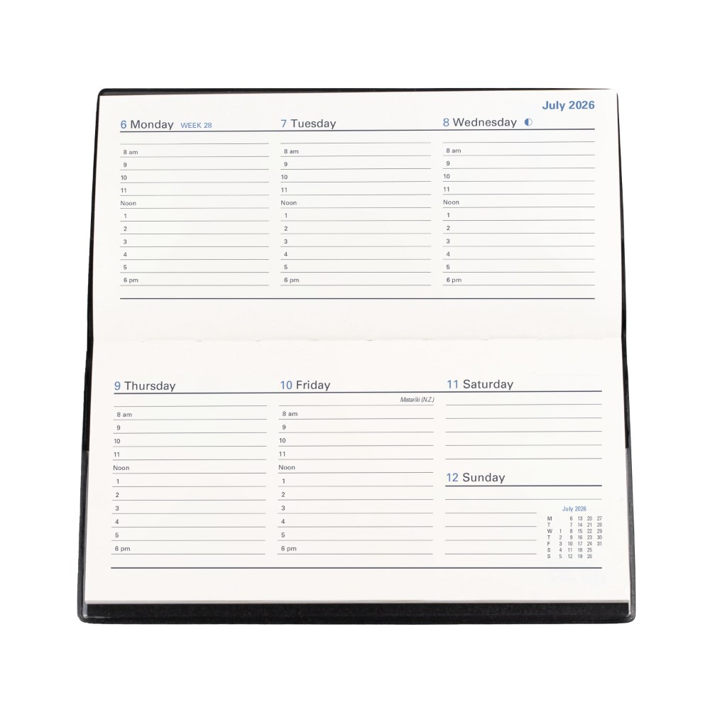 Bound in durable, welded PVC, the Belmont is available in black, burgundy and navy. Printed on white paper. 3 year calendars. Forward year planners. Calendar notes. Australian and New Zealand holidays. Appointment times 8am - 6pm hourly. Notes. Size: 176 x 88mm. FSC Certified.