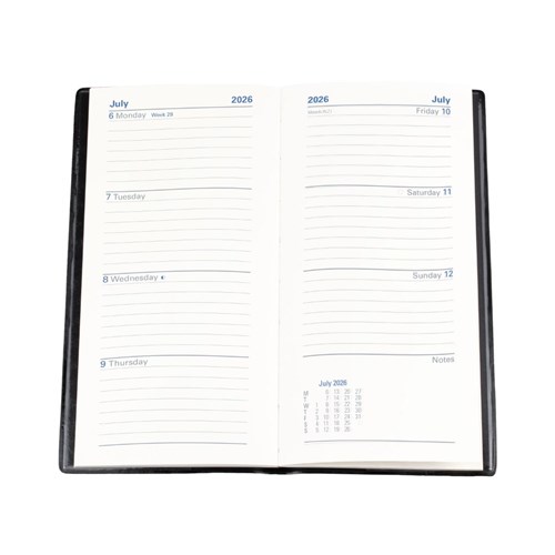 Bound in durable, welded PVC, the Belmont is available in black, burgundy and navy. Printed on white paper. 3 year calendars. Forward year planners. Calendar notes. Australian and New Zealand holidays. Notes. Size: 176 x 88mm. FSC Certified.