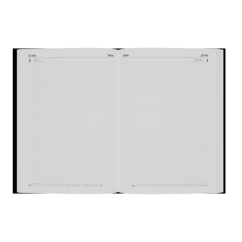 The planning 'Essential' dated range, offers excellent value for money and a host of practical features. Practical layout that will suit academic and personal use, in the classroom, office, at home, and on the go. Available in Week to view and Day to a page layouts. Durable leather grain covers. Gold foiled date stamp. Personal directory. Yearly planners. Ribbon marker. Lay flat opening. Notes pages. International holidays and dialling. Size: 297 x 210mm. FSC Certified.