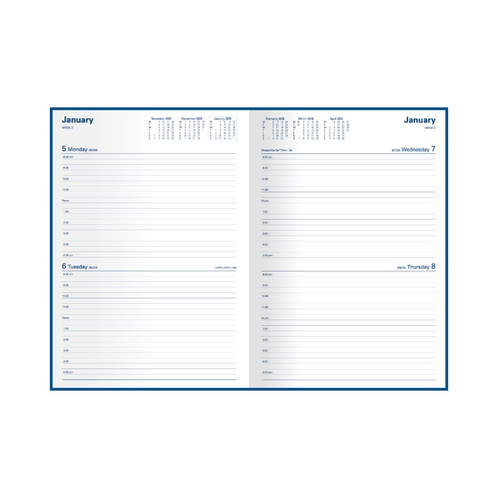 Hardwearing, linen-look cover. Extensive range of internal features, including notes, planners and essential information. Lay flat opening, ribbon marker, 2 days to a page layout. Appointment times from 8am -5pm hourly. Australian and New Zealand holidays. 3 year calendars. Current and forward year planners. Monthly planners, addresses and notes. Tax information, staff leave and financial summary. International holidays and International dialling. Size: 297 x 210mm. FSC Certified.