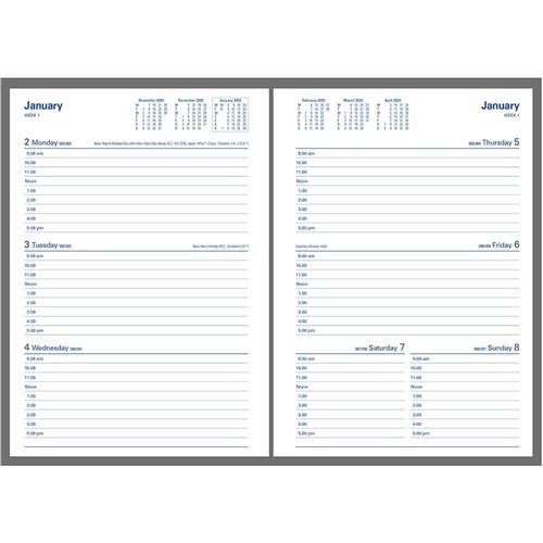 Hardwearing, linen-look cover. Extensive range of internal features, including notes, planners and essential information. Lay flat opening, ribbon marker, week to view layout. Appointment times from 9am -5pm hourly. Australian and New Zealand holidays. 3 year calendars. Current and forward year planners. Monthly planners, addresses and notes. Tax information, staff leave and financial summary. International holidays and International dialling. Size: 210 x 148mm. FSC Certified.