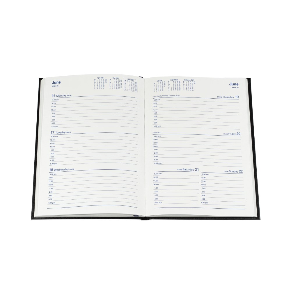 Smooth leather look diary. Australian and New Zealand capital city maps and holidays. Appointment times from 9am - 5pm hourly. 3 year calendars. Current and forward year planners. International holidays. International dialling. Staff leave planner. Addresses and notes. Size: 210 x 148mm. FSC Certified.