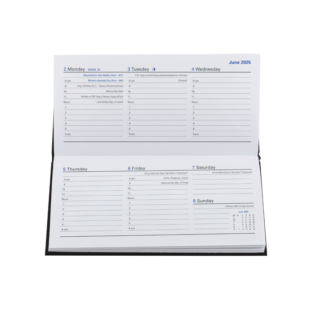 This sophisticated smooth leather-look diary comes complete with all of the features expected of a Collins diary, including crisp, easy-to-read graphics and a comprehensive information section. Australian and New Zealand Capital City Maps and Holidays. Appointment times from 8am - 6pm. 3 Year calendars. Current and Forward Year Planners. International holidays. International dialling. Staff leave planner. Addresses and notes. Size: 182x93mm.
