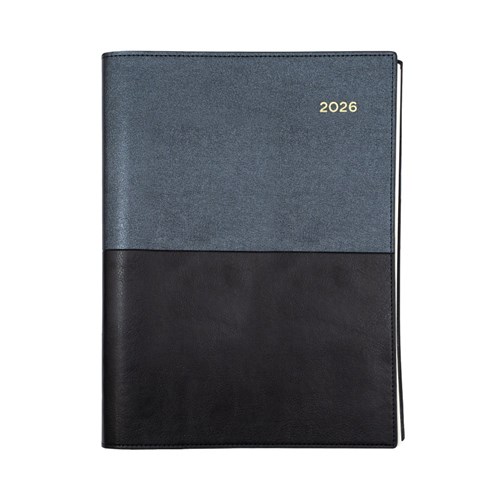 The best selling Vanessa Diary is the diary of choice for astute professionals. Its durability is assured with double wire binding and heavy-grained metallic and matt PU cover. Printed on a subtle cream paper, each dated page layout features a six-month to opening calendar, week numbers, Julian days, as well as both national and international public holidays. Internal storage pocket, addresses and notes. Pen loop, lay flat opening, ribbon marker, day to page layout. Appointment times from 8am - 6pm 1/2 hourly. Staff leave and financial summary. 3 Year calendars, Current and forward year planners. International dialling and time zone map. Size: 297 x 210mm. FSC Certified.