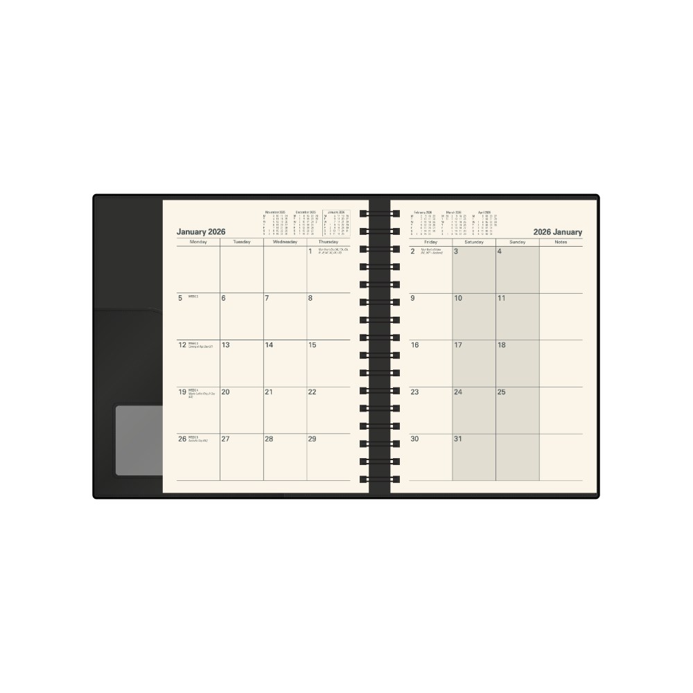 • Pen loop, lay flat opening, ribbon marker and month to view layout.