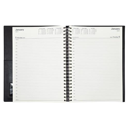Ideal for those 'on the move' with its double wiro binding and heavily grained metallic and matt PU cover. Has a removable jacket sleeve, pen loop and internal storage pockets. Half hourly appointment times. Monthly planners, staff leave and financial summary. 3 year calendars. Addresses and notes. Australian and New Zealand holidays. Current and forward year planners. Tax information.