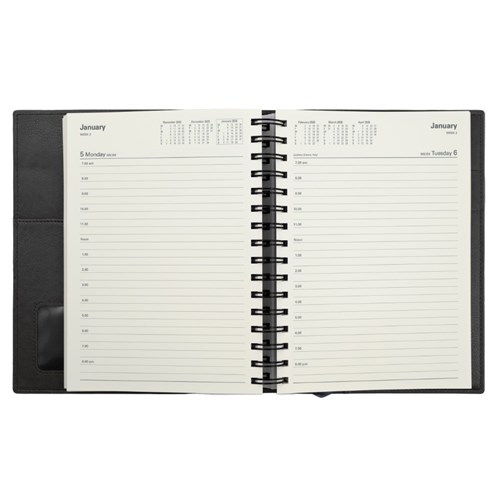 Ideal for those 'on the move' with its double wiro binding and heavily grained metallic and matt PU cover. Has a removable jacket sleeve, pen loop and internal storage pockets. Hourly appointment times. Monthly planners, staff leave and financial summary. 3 year calendars. Addresses and notes. Australian and New Zealand holidays. Current and forward year planners. Tax information.