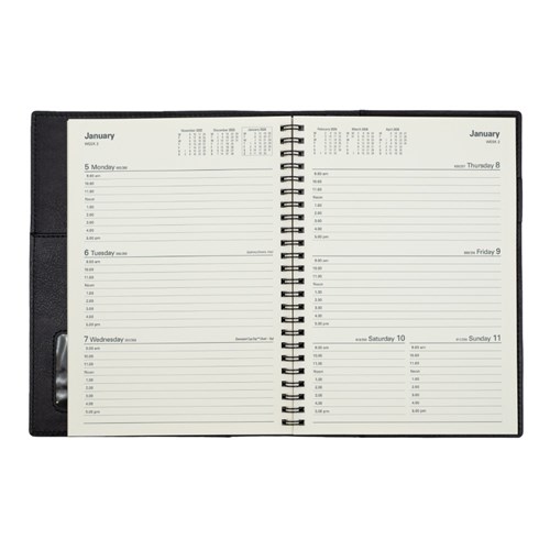 Ideal for those 'on the move' with its double wiro binding and heavily grained metallic and matt PU cover. Has a removable jacket sleeve, pen loop and internal storage pockets. Hourly appointment times. Monthly planners, staff leave and financial summary. 3 year calendars. Addresses and notes. Australian and New Zealand holidays. Current and forward year planners. Tax information.
