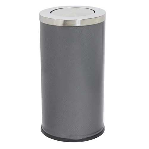 The swing mechanism can be unbolted so the bin can be used as a standard bin. Colour: Brushed stainless steel and hammertone grey powder coated body finish. Galvanized liner with rubber base. Size: 380 Diameter x 730mmH.