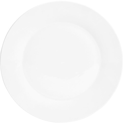 Basics crockery range. Durable porcelain gloss finish. Classic rimmed design. Microwaveable and dishwasher safe. 255mm Diameter.