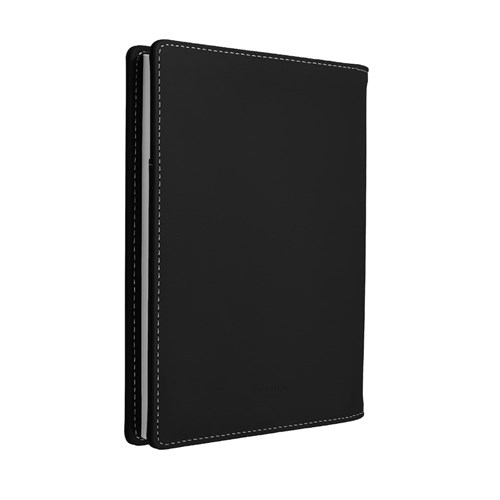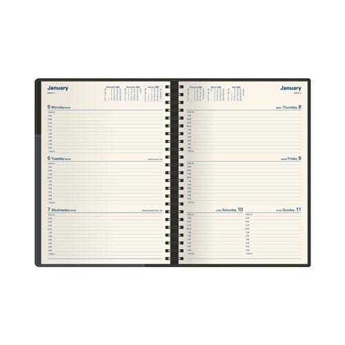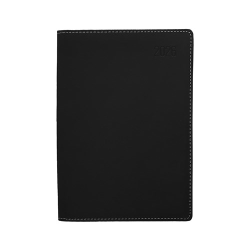 Soft-touch padded cover. Lay flat wiro binding with ribbon marker. Document pocket and business card sleeve. Appointment times from 8am - 7pm hourly. Australian and New Zealand holidays. 3 year calendars. Current and forward year planners. International holidays, dialling and time zones. Staff Leave planner. Addresses and notes. Size: 297 x 210mm. FSC Certified.