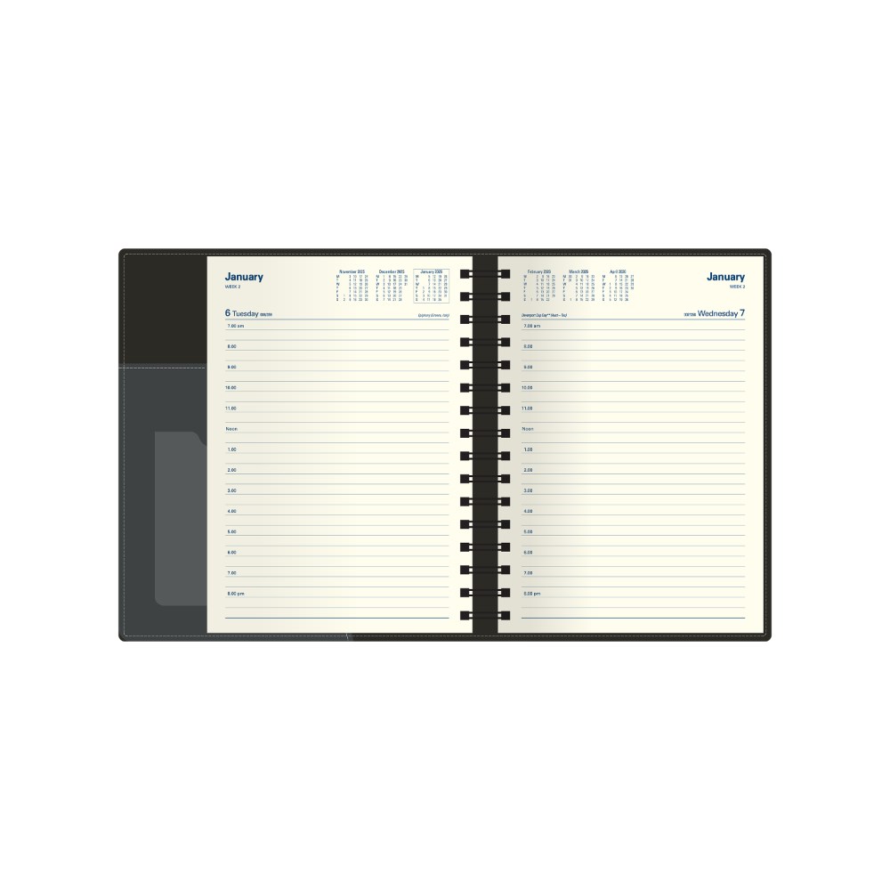 Soft-touch padded cover. Lay flat wiro binding with ribbon marker. Document pocket and business card sleeve. Appointment times from 7am - 8pm 1/2 hourly. Australian and New Zealand holidays. 3 year calendars. Current and forward year planners. International holidays, dialling and time zones. Staff Leave planner. Addresses and notes. Size: 210 x 148mm. FSC Certified.