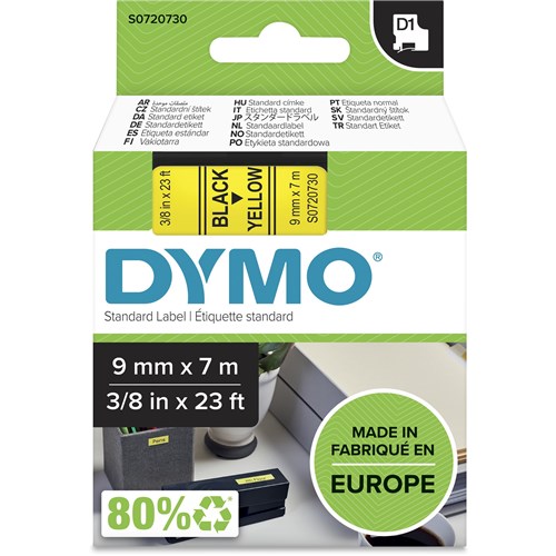 • Dymo D1 Label Cassette Tape 9mmx7m Black on Yellow