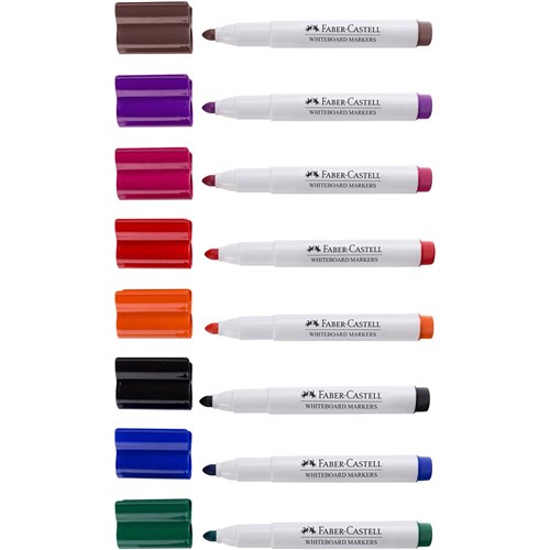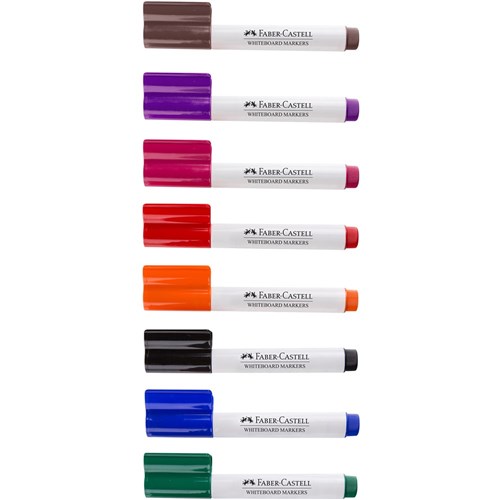 8 bright, vibrant colours in Red, Pink, Orange, Green, Blue, Violet, Brown and Black Big 3mm Bullet tips for better line visibility on large boards Ink effortlessly dry-erases for easy, residue-free clean-up Durable felt-nibs create consistent, precise lines Long-lasting ink means fewer marker replacements Whiteboard ink is safe and non-toxic for peac of mind 100 hour cap-off time reduces stress over lost lids Convenient connector caps allow for quick and easy storage