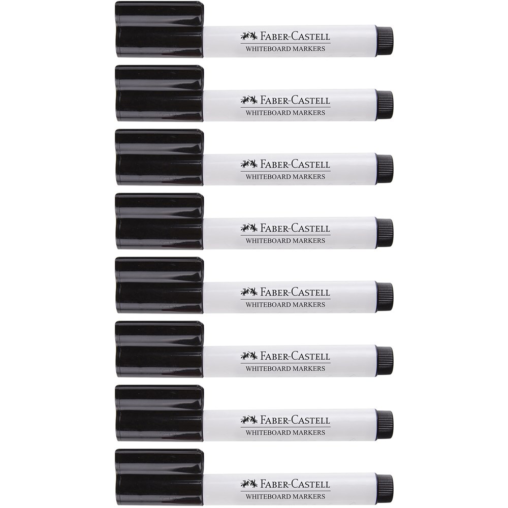 Includes 8 BLACK ONLY Faber-Castell Connector Pen Whiteboard Markers Big 3mm Bullet tips for better line visibility on large boards Convenient connector caps allow for quick and easy storage Bright, vibrant colours help to organise big ideas Ink effortlessly dr-erases for easy, residue-free clean-up Durable felt-nibs create consistent, precise lines Long-lasting ink means fewer marker replacements Whiteboard ink is safe and non-toxic for peace of mind 100 hour super cap off time