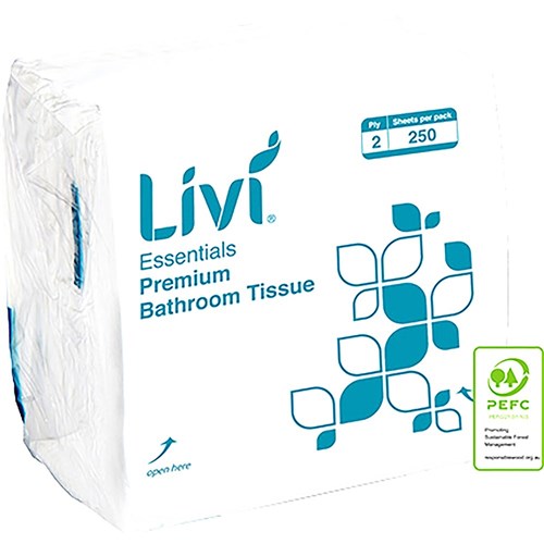 This interleave 2 Ply toilet tissue provides both strength and comfort. The compact size of the interleave paper dispenser is suited for small spaces such as portaloos. 100% sustainable virgin fibre that is independently certified annually by PEFC. To suit Livi toilet dispenser 5503.
