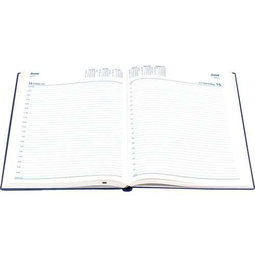 Stylish hardcover casebound diary with blue leather grain cover. Includes Australian and New Zealand holidays and school terms. Current planner. Reference calendars. 30 minute appointment times 8:00am - 6:00pm. Calendar notes. World holidays. International and National dialling. Conversion table. Weights and measures table. Breeding table. Rain chart. Staff leave.