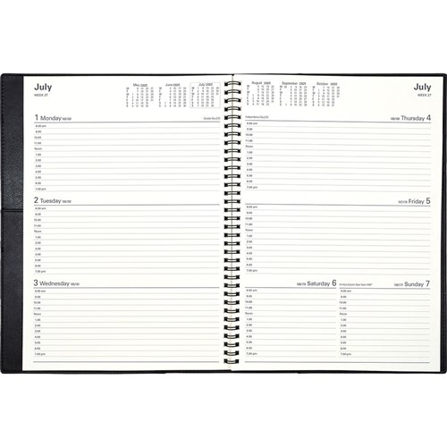 Flexible PVC cover management wiro diary, stitched edges and deluxe pocket inside the cover. Twin wiro allows you to lay the diary flat on your desk. Includes Australian and New Zealand holidays and school terms. Reference calendars. World holidays. 1 hour appointment times 8:00am - 7:00pm. Conversion table. International and National dialling codes. Weights and measures table. International paper sizes. Staff leave. Monthly expenses. Current planner.