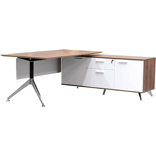 High quality melamine. MDF and shark nose edging. Buffet return with lockable 1 pencil drawer, 1 filing drawer and 2 doors in white. White modesty panel Aluminium feet. 3 Year Manufacturer's Warranty. Delivery, installation and assembly charges may apply to furniture. Please enquire to confirm.