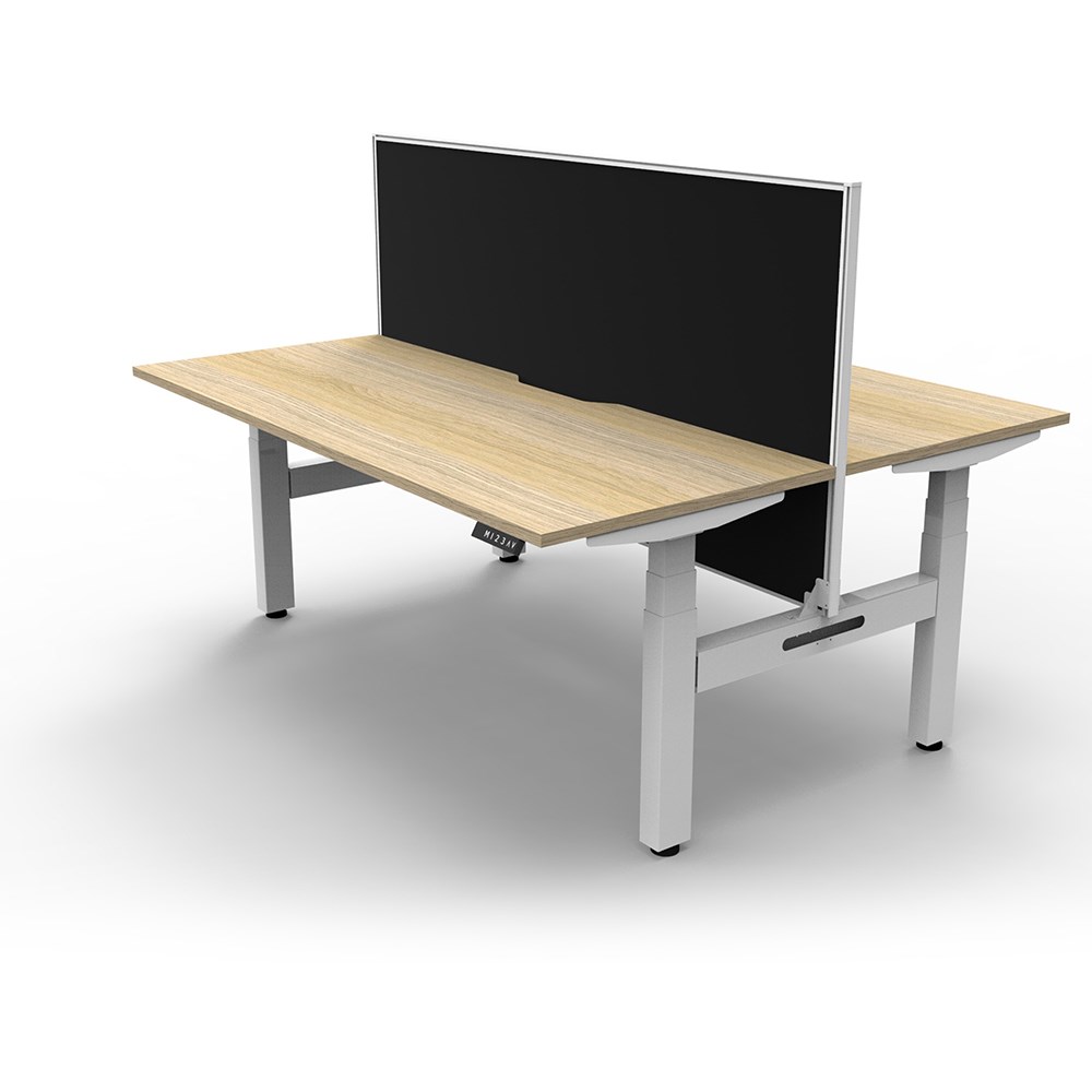 The entire Boost+ range has now been performance tested and is compliant to the AFRDI standards for general safety, strength, durability and stability in all sizes and configurations based on AS/NZS 4442:201. Unit Dimension: 1200mm W x 1500mm D x 1330mm H (Overall). Per User: 1200mm W x 750mm D. Desk Height: 620-1270mm H. Includes pinnable privacy screen in black fabric with matching white powder coated frame. 900mm H x 30mm T. Smooth and quiet adjustment at 38mm per second. Min Digital control panel with 3 pre-set positions, LED display panel, keypad safety lock and reminder alarm setting. Natural Oak coloured worksurface with 750mm depth top. 50mm D scallop cut out to rear. Back to Back Workstation with Screen. Dual Motor 3 stage motorised legs. 140kg weight loading capacity. 10 Year Manufacturer's Warranty.