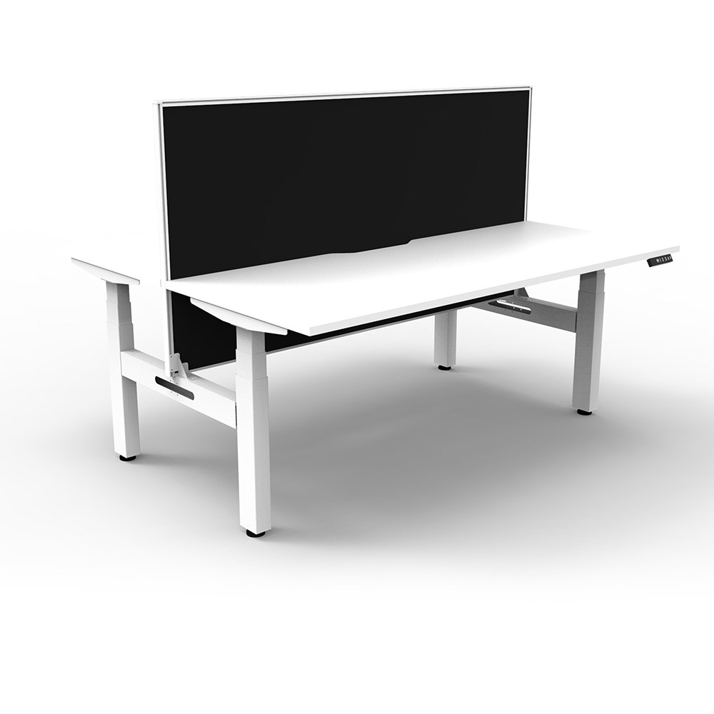 The entire Boost+ range has now been performance tested and is compliant to the AFRDI standards for general safety, strength, durability and stability in all sizes and configurations based on AS/NZS 4442:201. Unit Dimension: 1500mm W x 1500mm D x 1330mm H (Overall). Per User: 1500mm W x 750mm D. Desk Height: 620-1270mm H. Includes pinnable privacy screen in black fabric with matching white powder coated frame. 900mm H x 30mm T. Smooth and quiet adjustment at 38mm per second. Min Digital control panel with 3 pre-set positions, LED display panel, keypad safety lock and reminder alarm setting. Natural White coloured worksurface with 750mm depth top. 50mm D scallop cut out to rear. Back to Back Workstation with Screen. Dual Motor 3 stage motorised legs. 140kg weight loading capacity. 10 Year Manufacturer's Warranty.