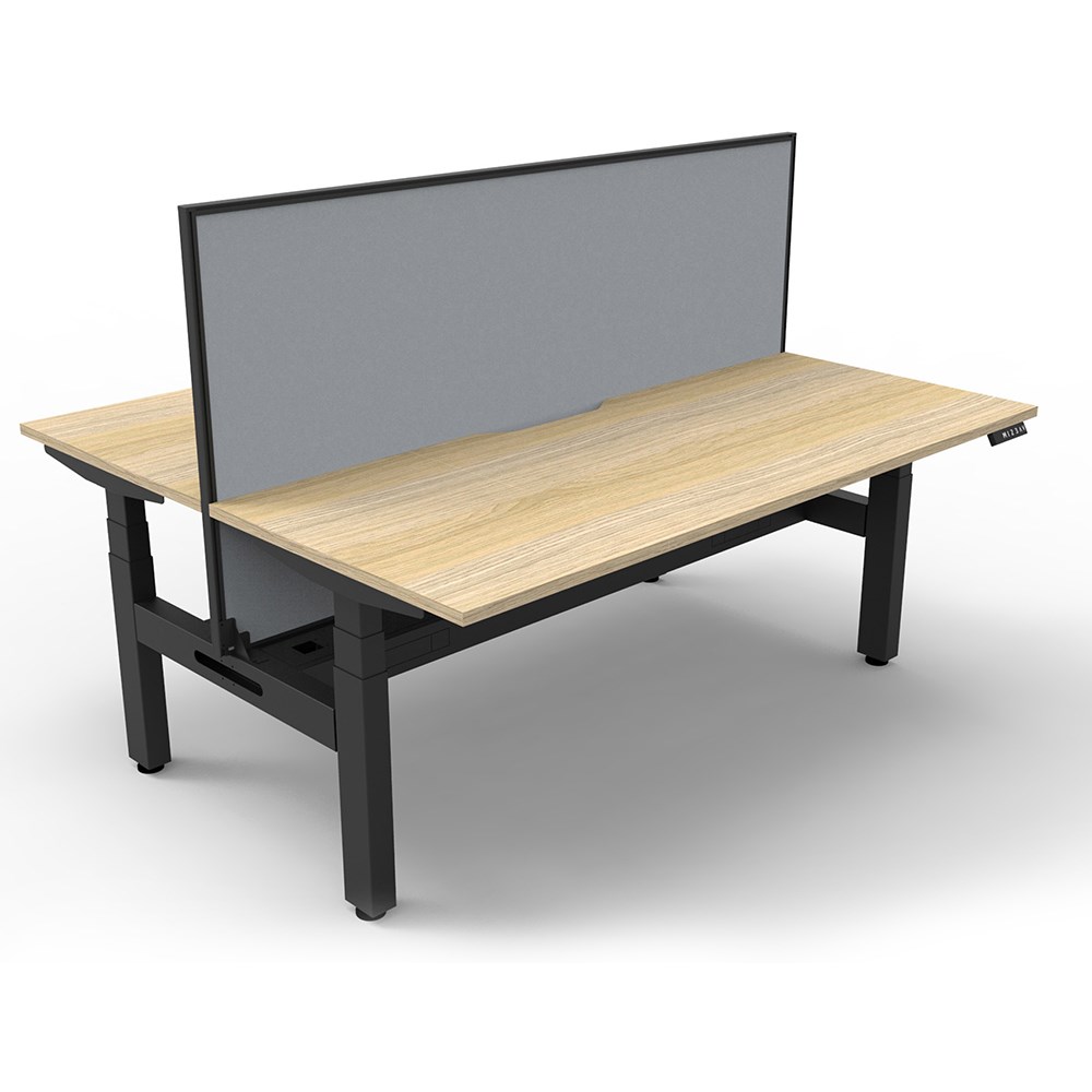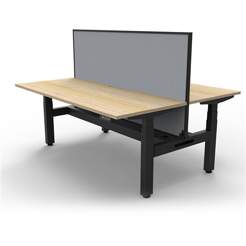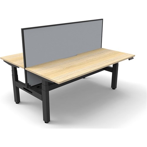 The entire Boost+ range has now been performance tested and is compliant to the AFRDI standards for general safety, strength, durability and stability in all sizes and configurations based on AS/NZS 4442:201. Unit Dimension: 1800mm W x 1500mm D x 1330mm H (Overall). Per User: 1800mm W x 750mm D. Desk Height: 620-1270mm H. Includes pinnable privacy screen in grey fabric with matching black powder coated frame. 900mm H x 30mm T. Smooth and quiet adjustment at 38mm per second. Min Digital control panel with 3 pre-set positions, LED display panel, keypad safety lock and reminder alarm setting. Natural Oak coloured worksurface with 750mm depth top. 50mm D scallop cut out to rear. Back to Back Workstation with Screen and Cable Tray. Dual Motor 3 stage motorised legs. 140kg weight loading capacity. 10 Year Manufacturer's Warranty.
