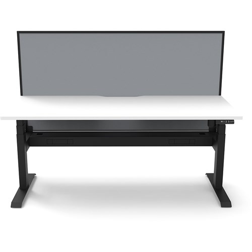 White top with Black frame. Unit Dimension: 1800mm W x 750mm D x 1330mm H. 620-1270mm height range for desk. E0 rated top. Powdercoat base. Digital control panel with 3 pre-set positions, LED display panel, keypad safety lock & reminder alarm setting. Anti-collision technology, noise emission of less than 50DB. Lifting capacity of 80kg with a max speed of 25mm per second. 700mm wide foot size with adjustable leveling feet. Comes with 30mm thick privacy screens and cable tray for cable management. 10 Year Manufacturer's Warranty. Delivery, installation and assembly charges may apply to furniture. Please enquire to confirm.
