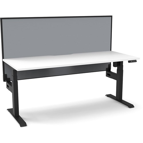 White top with Black frame. Unit Dimension: 1800mm W x 750mm D x 1330mm H. 620-1270mm height range for desk. E0 rated top. Powdercoat base. Digital control panel with 3 pre-set positions, LED display panel, keypad safety lock & reminder alarm setting. Anti-collision technology, noise emission of less than 50DB. Lifting capacity of 80kg with a max speed of 25mm per second. 700mm wide foot size with adjustable leveling feet. Comes with 30mm thick privacy screen. 10 Year Manufacturer's Warranty. Delivery, installation and assembly charges may apply to furniture. Please enquire to confirm.