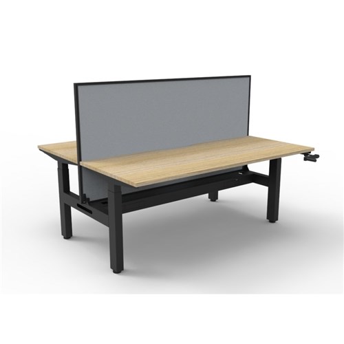 Rapidline Boost back to back 2 person manual crank height adjustable workstation with cable tray and screen. Oak top with black frame. Dimensions: 1800W x 750D x 705 - 1155mmH per user. Overall height including Screen: 1330mmH. Column Size: 90mm x 60mm. Frame Height: 680mm - 1130mm. Max Speed: 15mm per second (10mm per full turn circle). 1800W x 30T x 900mmH pinnable privacy screen finished in grey fabric with matching black powder coated extrusion. Fully ducted cable tray with punchout for power and data to be fitted to either external or internal of frame. HE0 rated 25mm thick table top. Rigid edging and 50mm D Scallop cut out to rear underframe. Adjustable leveling feet. Foot Size: 700mm. Desk Mounting Top Plate Size: 500mm. Steel Gauge: 3.0mm, 2.0mm and 1.5mm used throughout. 10 Year Manufacturer's Warranty. Delivery, installation and assembly charges may apply to furniture. Please enquire to confirm.
