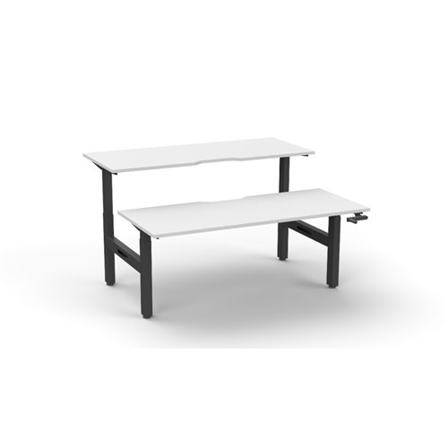• Rapidline Boost back to back 2 person manual crank height adjustable workstation. White top with black frame.