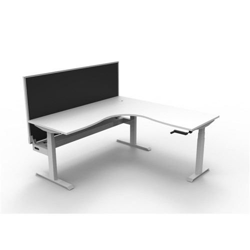Rapidline Boost manual crank height adjustable corner workstation with cable tray and screen. White top with white frame. Dimensions: 1800W x 1800W x 750D x 705mm - 1155mmH. Overall height including Screen: 1330mmH. Column Size: 90mm x 60mm. Frame Height: 680mm - 1130mm. Max Speed: 15mm per second (10mm per full turn circle). 1800W x 30T x 900mmH pinnable privacy screen finished in grey fabric with matching white powder coated extrusion. Fully ducted cable tray with punchout for power and data to be fitted to either external or internal of frame. Column Size: 90mm x 60mm. Foot Size: 700mm for main desk and 500mm for return frame. Adjustable leveling feet. E0 Rated 25mm thick table top with rigid edging and 80mm diameter cable entry with cover. Desk mounting top plate size: 500mm. Steel Gauge: 3.0mm, 2.0mm and 1.5mm used throughout. 10 Year Manufacturer's Warranty. Delivery, installation and assembly charges may apply to furniture. Please enquire to confirm.