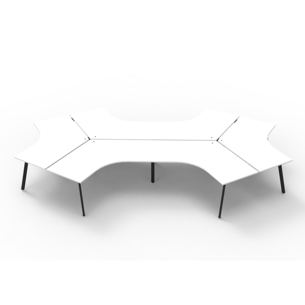 Overall Dimensions: 2866W x 2480D x 730mmH. Dimensions Per User: 1205W x 1205D x 730mmH. White worksurface with a 60 x 30mm powder coated black Eternity leg underframe. 1 x 80mm diameter cable entry hole. 30mm cable access void in between double sided users. Infill rail available at additional cost. Dual cross bar for added stability. E0 enviroboard melamine worksurface. Adjustable leveling feet. 5 Year Manufacturer's Warranty. Delivery, installation and assembly charges may apply to furniture. Please enquire to confirm.