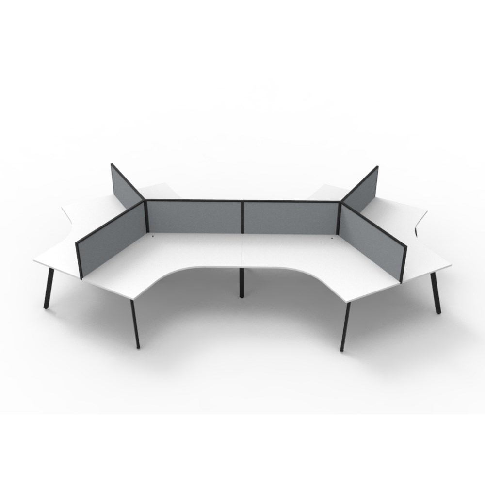Overall Dimensions Including Screen: 2866W x 2480D x 1200mmH. Dimensions Per User: 1205W x 1205D x 730mmH. 495mm height x 30mm thick pinnable privacy screen upholstered in grey fabric with matching powder coated extrusion and screen. White worksurface with a 60 x 30mm powder coated black Eternity leg underframe. 30mm cable access void in between double sided users. Infill rail available at additional cost. Dual cross bar for added stability. 1 x 80mm diameter cable entry hole. E0 enviroboard melamine worksurface. Adjustable leveling feet. 5 Year Manufacturer's Warranty. Delivery, installation and assembly charges may apply to furniture. Please enquire to confirm.