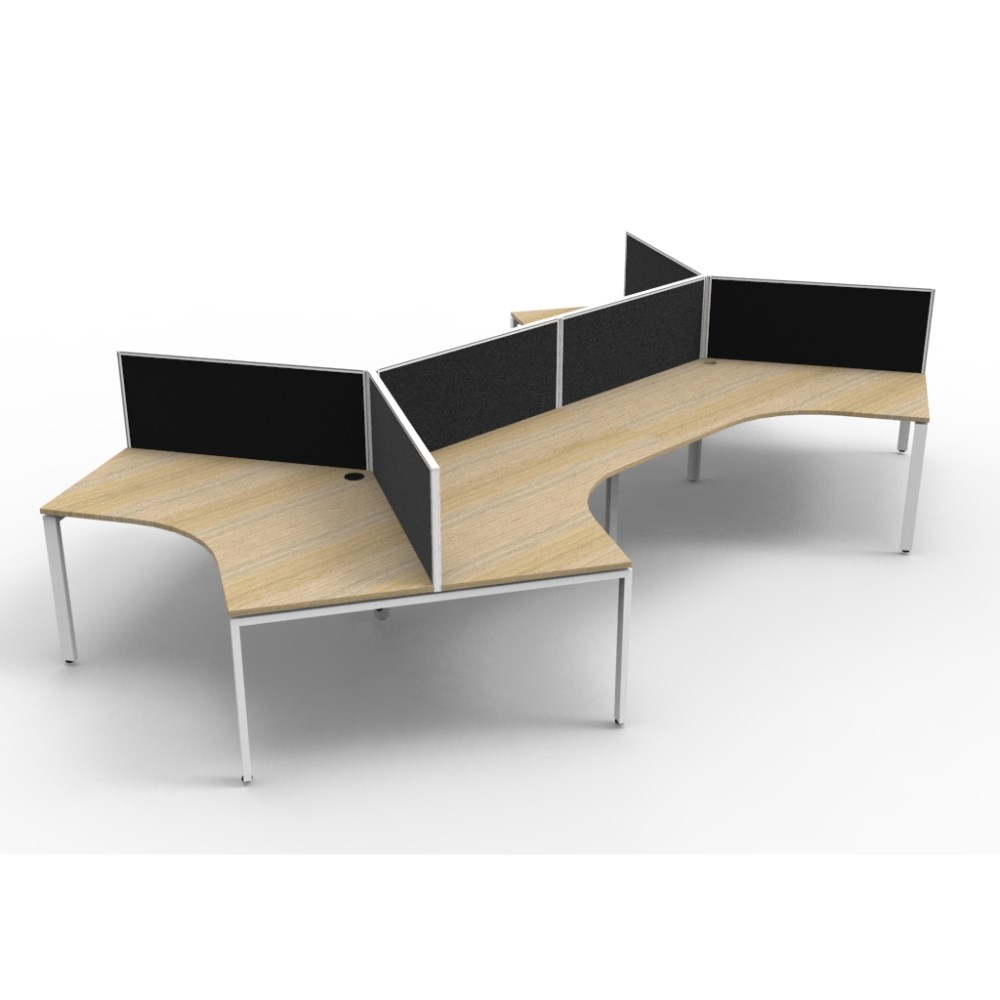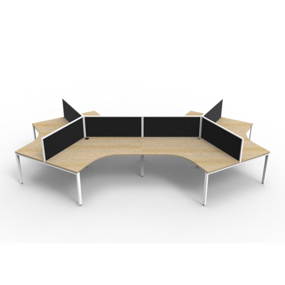 Overall Dimensions: 2866W x 2480D x 1200mm H. Per User Dimensions: 1205W x 1205D x 730mmH. Natural oak worksurface with a 60 x 30mm powder coated white Profile leg underframe and screen. 495mm high x 30mm thick pinnable privacy screen upholstered in grey fabric with matching powder coated extrusion. 1 x 80mm diameter cable entry hole. 30mm cable access void in between double sided users. Infill rail available at additional cost. Dual cross bar for added stability. E0 enviroboard melamine worksurface. Adjustable leveling feet. 5 Year Manufacturer's Warranty. Delivery, installation and assembly charges may apply to furniture. Please enquire to confirm.