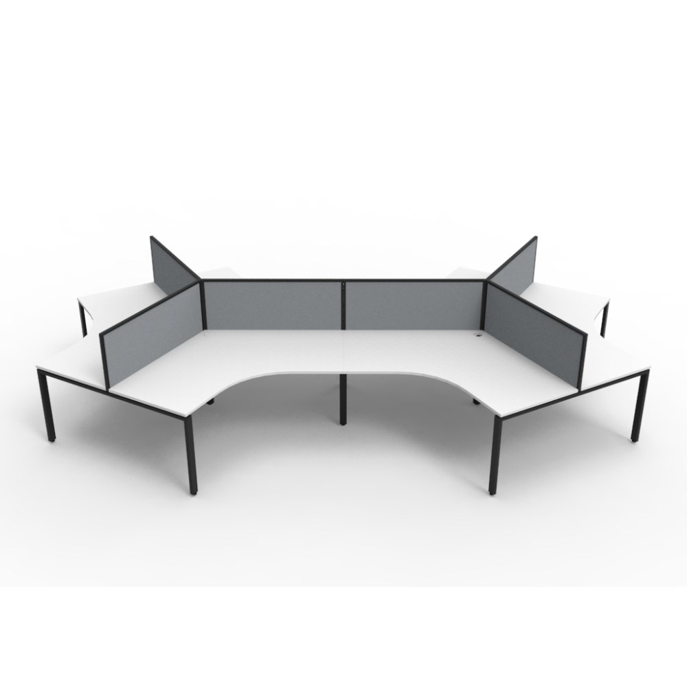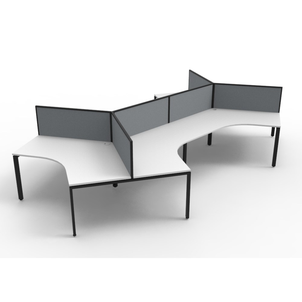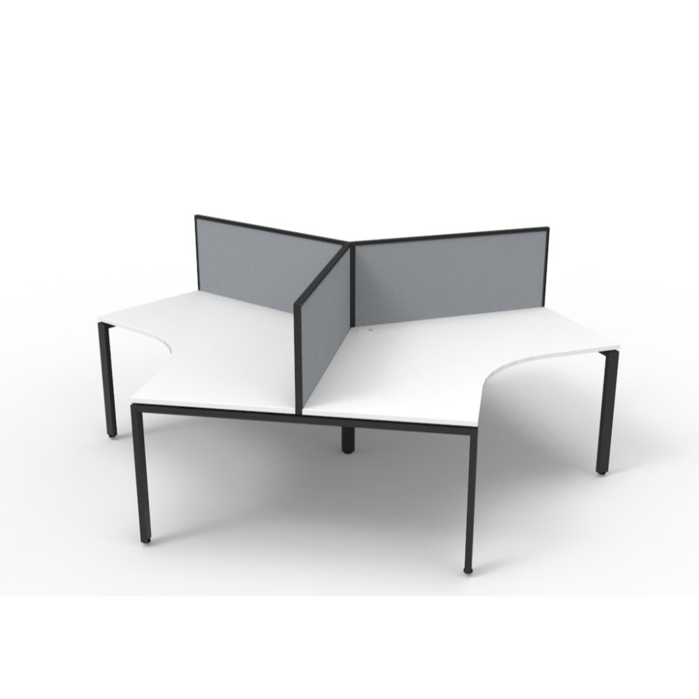 Overall Dimensions: 2866W x 2480D x 1200mm H. Per User Dimensions: 1205W x 1205D x 730mmH. White worksurface with a 60 x 30mm powder coated black Profile leg underframe and screen. 495mm high x 30mm thick pinnable privacy screen upholstered in grey fabric with matching powder coated extrusion. 1 x 80mm diameter cable entry hole. 30mm cable access void in between double sided users. Infill rail available at additional cost. Dual cross bar for added stability. E0 enviroboard melamine worksurface. Adjustable leveling feet. 5 Year Manufacturer's Warranty. Delivery, installation and assembly charges may apply to furniture. Please enquire to confirm.