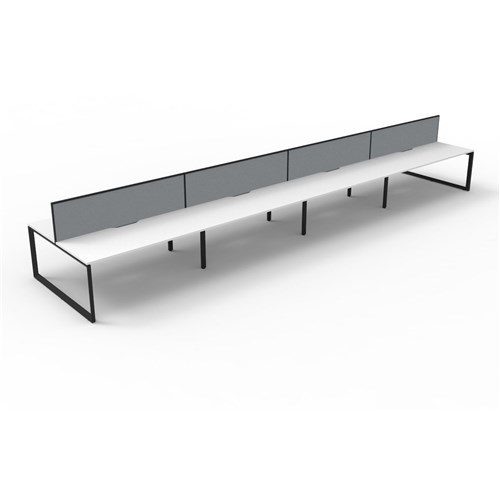 Maximise space and create an efficient working environment with Deluxe Rapid Infinity. With scallop for cable access, and a recessed leg to create full leg access in long runs of workstations. Overall Including Screen: 6000mm W x 1530mm D x 1200mm H. Per User: 1500mm W x 750mm D. Desk Height: 730mm. Includes pinnable privacy screen in grey fabric with matching black powder coated frame. 495mm H x 30mm T. With 410mm W x 50mm D Scallop Cable Access. 60mm x 45mm bevelled edge powder coated Loop Leg underframe. Recessed leg to create full leg access in long runs of workstations. Scalloped top for easy wire management. Double support rail for extra strength. Adjustable levelling feet. E0 Enviroboard. 5 Year Manufacturer's Warranty. Delivery, installation and assembly charges may apply to furniture. Please enquire to confirm.
